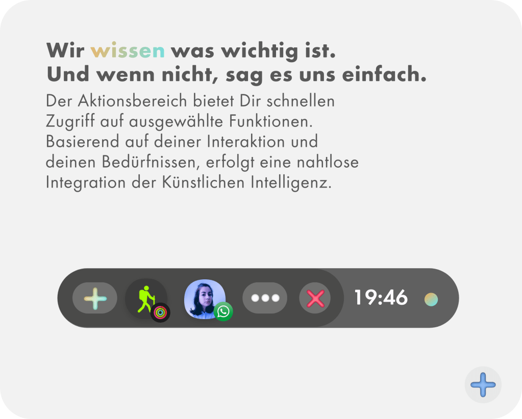 Willkommen in der Zukunft! Unser System kombiniert die Leistungsfähigkeit von Künstlicher Intelligenz mit der immersiven Welt der erweiterten Realität. Egal, ob du dich in der Stadt verirrst, nach Informationen suchst oder einfach nur nach Unterhaltung suchst – deine persönliche KI-Assistenz ist immer für dich da. Durch kontinuierliches Lernen und vorausschauende Berechnungen im Hintergrund antizipiert sie deine Bedürfnisse, bevor du überhaupt daran denkst. Von intelligenten Routenvorschlägen bis hin zu maßgeschneiderten Empfehlungen – erlebe eine ganz neue Dimension der Benutzerfreundlichkeit.
