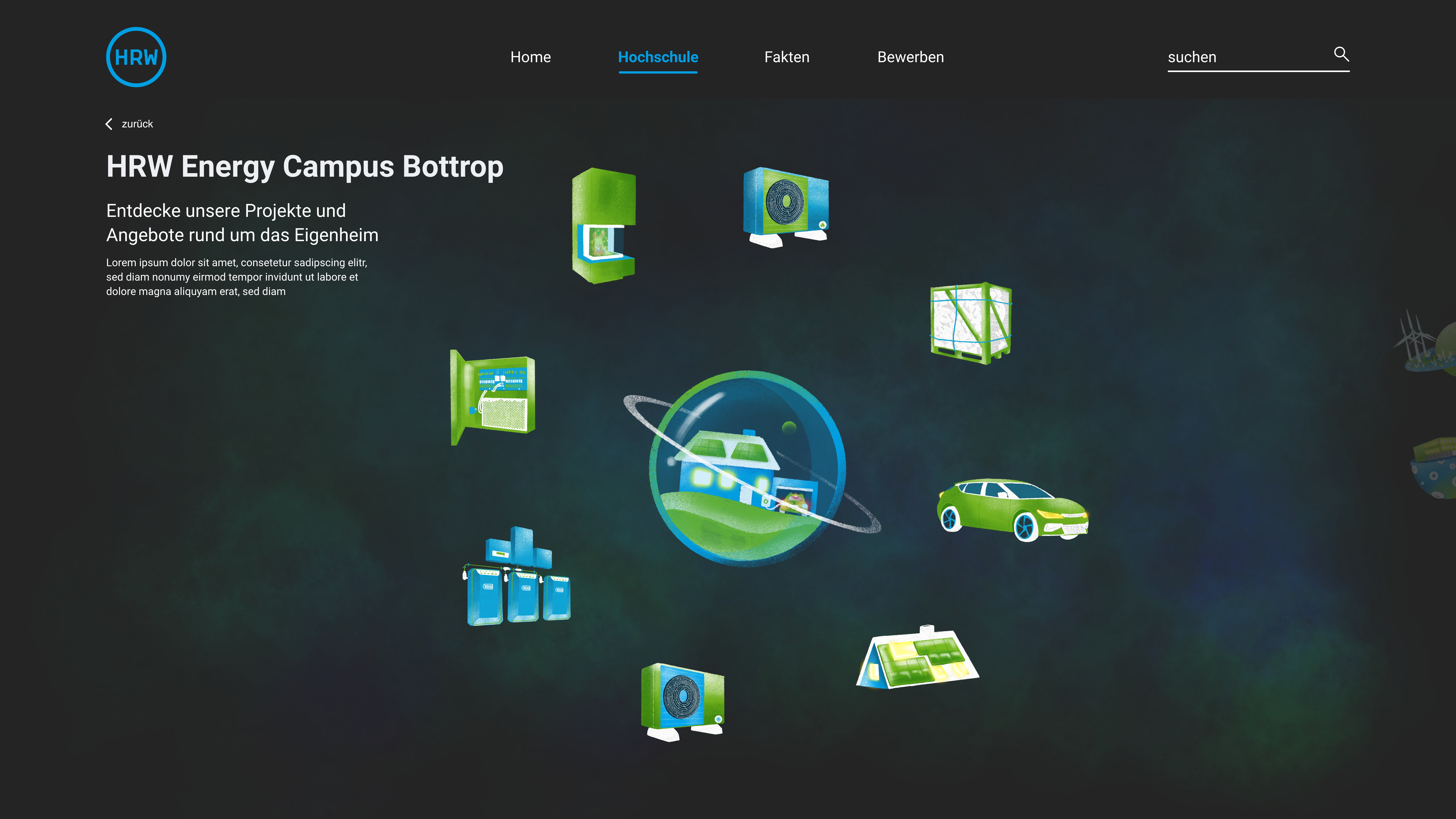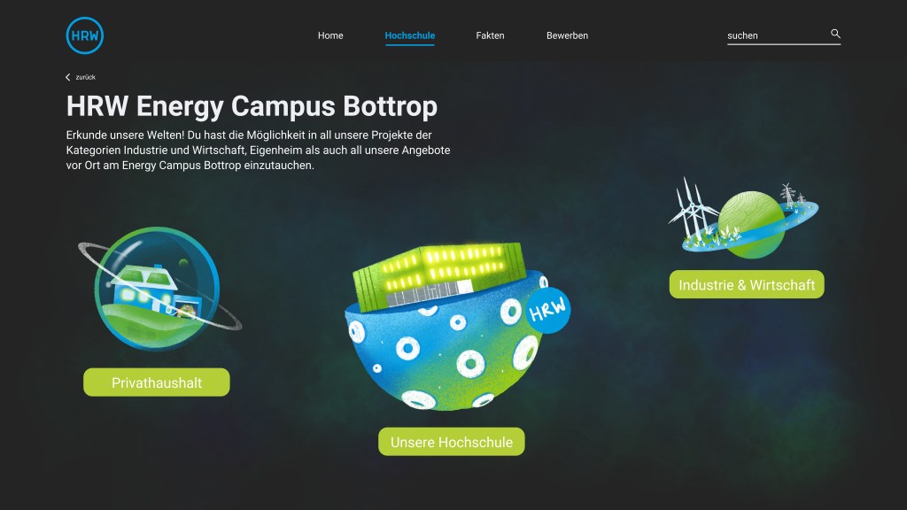In einem fiktiven Rebranding der HRW Bottrop, spezifischer dem HRW Energy Campus Bottrop, entstand das User Experience Konzept »HRW Universe«. Herzstück ist das Redesign der Landingpage des Energy Campus Bottrop. Integriert wird hier eine interaktive Galaxie in welcher sich Studieninteressierte über Projekte, Studiengänge und weitere Angebote der HRW Bottrop informieren können.