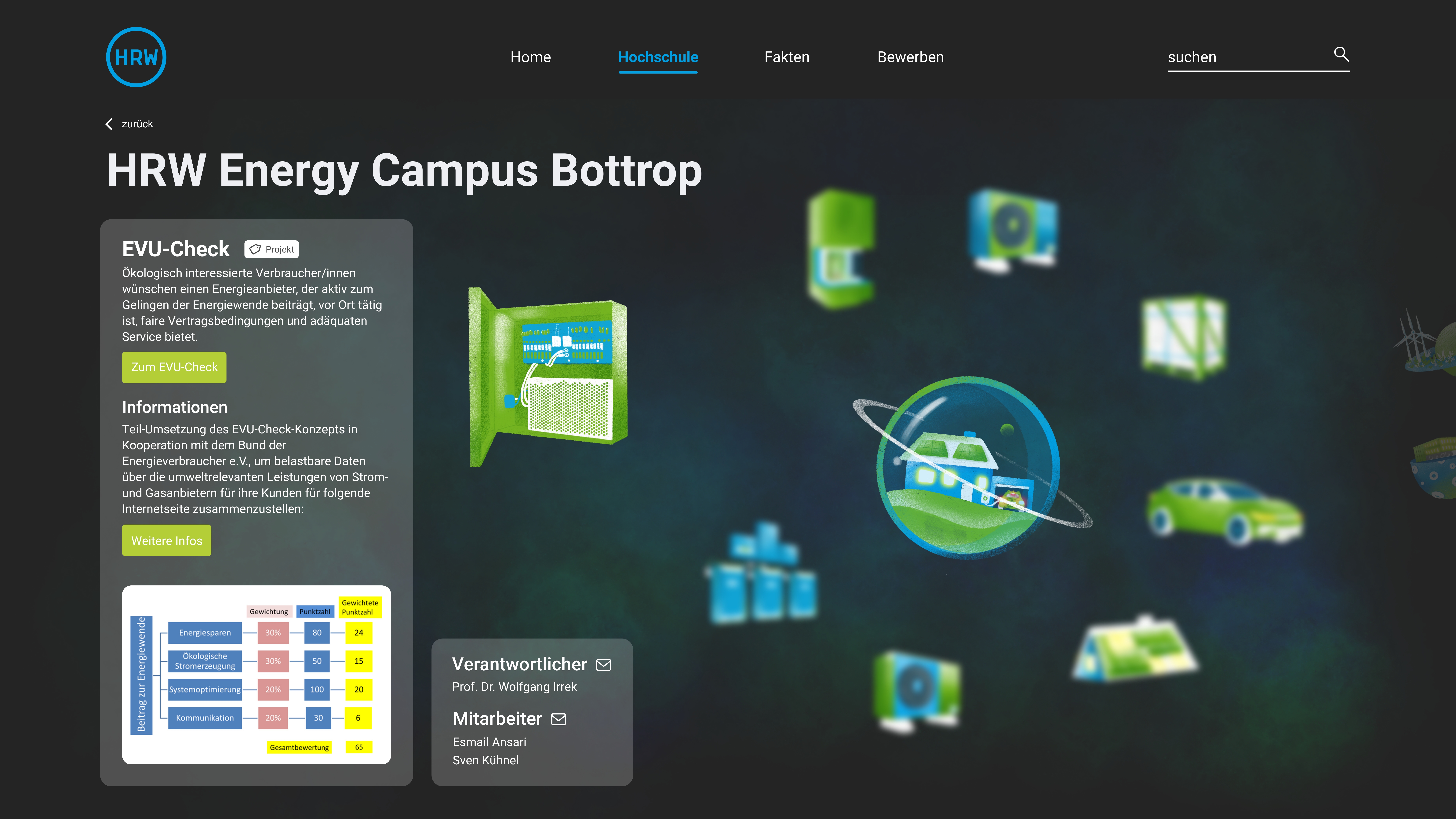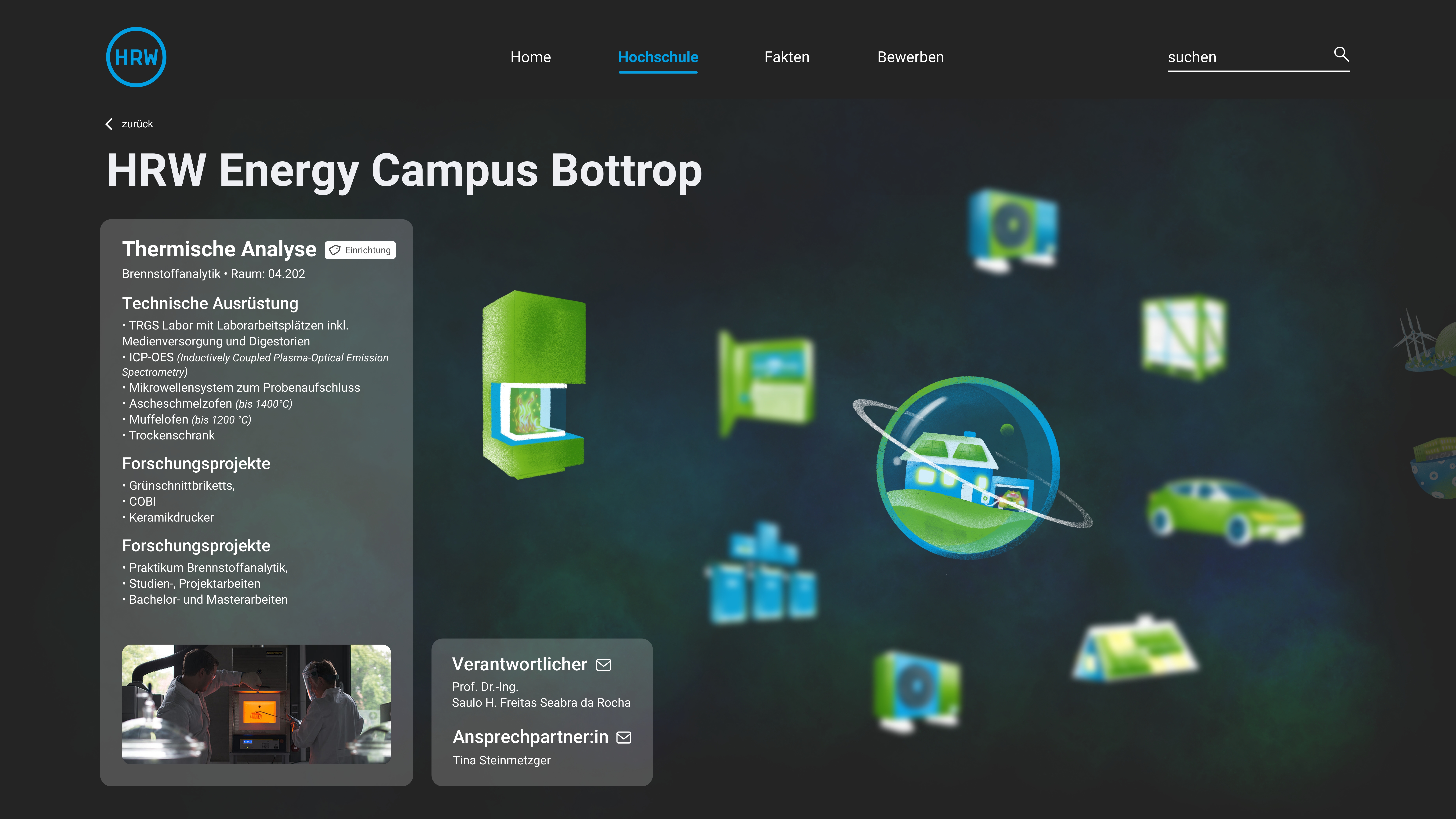 Aufgrund der Energiesparmöglichkeiten von modernen OLED Displays ist die komplette Webpräsenz im Darkmode gehalten. Diese strategische Entscheidung harmoniert perfekt mit den Energie-Projekten des Energy Campus. Die interaktive Navigation schafft es einen gezielten oder explorativen Blick – je nach Anwendungsfall – auf alle Angebote des Standorts Bottrop zu werfen. Stets im Mittelpunkt: Die HRW mit ihrer Vielfältigkeit.